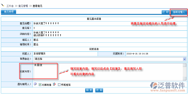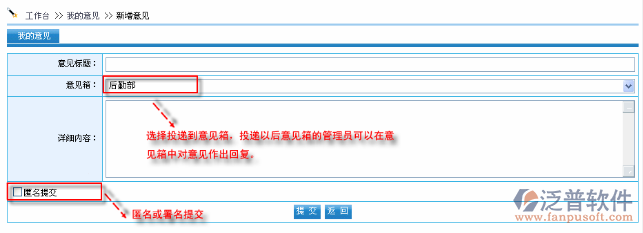提醒:只允許對(duì)允許管理的意見箱進(jìn)行管理,例如“后勤部”的意見箱為“系統(tǒng)管理員” 。那么“后勤部”意見箱里面的內(nèi)容只允許系統(tǒng)管理員查看。