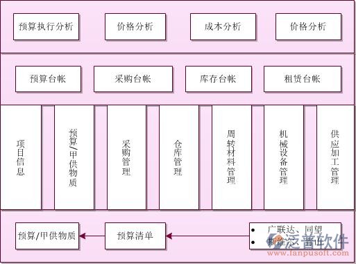 《泛普軟件泛普OA系統(tǒng)工程物質(zhì)管理軟件》主要系統(tǒng)功能包括:預(yù)算管理、采購管理、倉庫管理、周轉(zhuǎn)材料管理、機(jī)械設(shè)備管理、供應(yīng)加工管理等模塊。其系統(tǒng)功能模型圖如下: