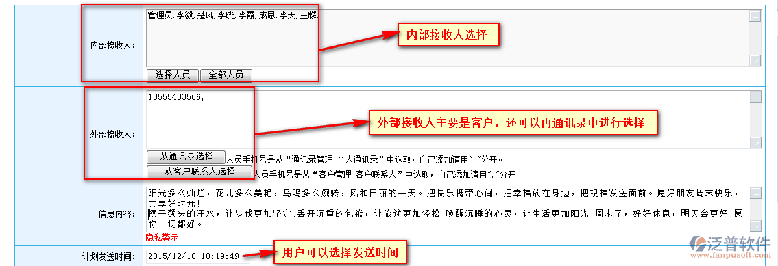 短信群發(fā)平臺(tái)是基于中國(guó)移動(dòng)、聯(lián)通、電信直接提供的短信端口與互聯(lián)網(wǎng)連接實(shí)現(xiàn)與客戶指定號(hào)碼進(jìn)行短信批量發(fā)送和自定義發(fā)送的,它分為軟件單機(jī)版(帶客戶端)CS 結(jié)構(gòu)和網(wǎng)絡(luò)共享版BS 結(jié)構(gòu)。在泛普CRM系統(tǒng)中您可以通過手機(jī)短信模塊發(fā)送和管理手機(jī)短息,電話無人接聽的話也可采取短信方式聯(lián)系。