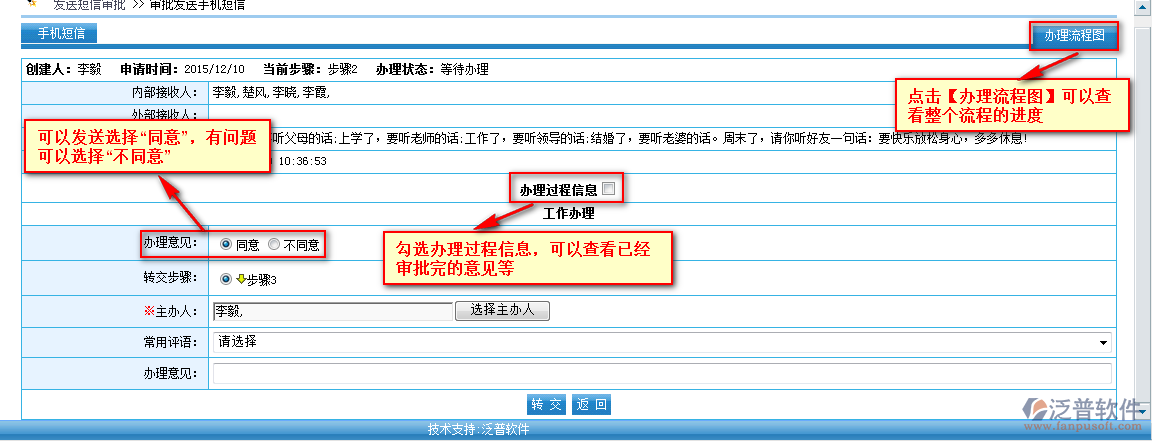 填寫完發(fā)送短信的基本信息后,即可進(jìn)行流程的審批過程