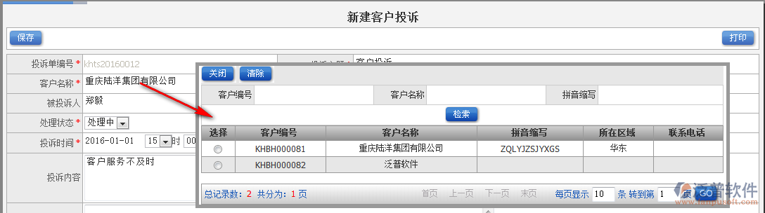 2.新建客戶投訴記錄,可了解到我們新建的詳細情況例如:投訴單編號、投訴主題、客戶名稱、客戶聯(lián)系人、處理人等詳細情況,如下圖所示: