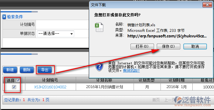 5、系統(tǒng)為用戶提供【導出】功能。選中需要導出的銷售計劃,點擊【導出】即可。如圖: