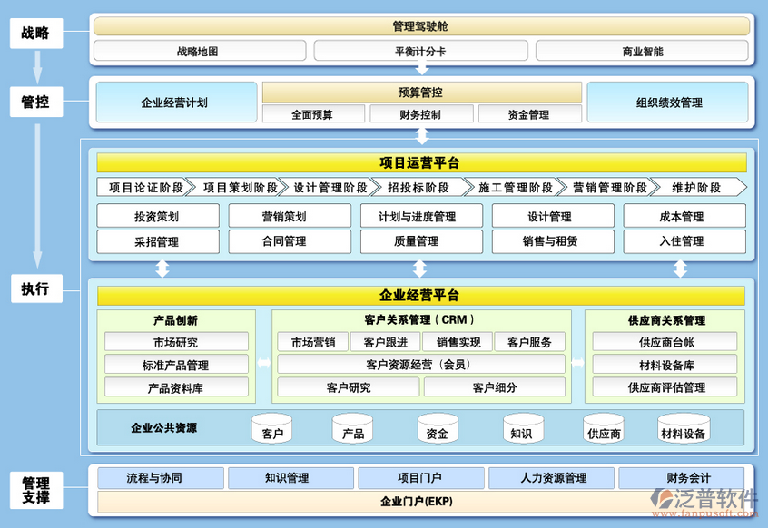 泛普軟件地產(chǎn)ERP充分立足房地產(chǎn)業(yè)務(wù)最佳實(shí)踐,將先進(jìn)管理思想及務(wù)實(shí)的流程模型深度集成到IT系統(tǒng),實(shí)現(xiàn)了“管理+IT+業(yè)務(wù)”三者的深度融合,使IT承接業(yè)務(wù)、輔助管理,有效支撐地產(chǎn)企業(yè)高效構(gòu)建從戰(zhàn)略到管控到執(zhí)行再到桌面的戰(zhàn)略執(zhí)行保障平臺(tái)。