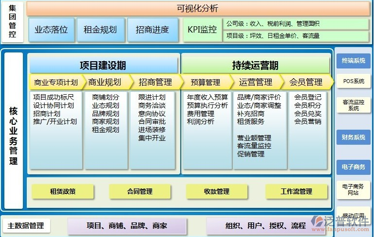 純B/S的系統(tǒng)架構(gòu),除了能夠完全滿足單一項目發(fā)展企業(yè)的訴求,同時也為跨區(qū)域多項目發(fā)展的企業(yè)管理提供了很好的支撐。通過對項目生命周期過程中的各項關(guān)鍵業(yè)務(wù)環(huán)節(jié)比如業(yè)態(tài)規(guī)劃、租金定價、招商進度等進行嚴格的管控,形成統(tǒng)一的管控標準,確保項目的順利發(fā)展。通過對各區(qū)域各項目關(guān)鍵KPI指標進行監(jiān)控考核,比如租金水平、收益指標等,及時發(fā)現(xiàn)異常,保證項目的順利經(jīng)營,確保項目經(jīng)營成果,利益最大化。