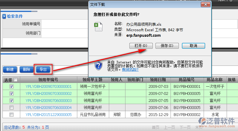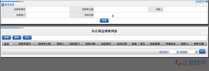 2、辦公用品領(lǐng)用頁面上半部分為檢索查詢條件,下半部分為辦公用品顯示列表。如圖: