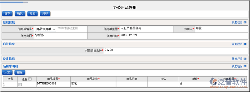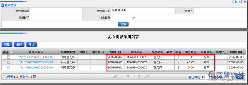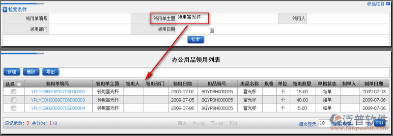 辦公用品領(lǐng)用在公司中是非常普遍行為,但是良好管理他們是非常有必要的事情。領(lǐng)用記錄可以追溯到每一個員工身上,方便管理我們的辦公用品使用情況。領(lǐng)用記錄主要可以通過:領(lǐng)用單編號、領(lǐng)用單主題、領(lǐng)用人、領(lǐng)用部門、領(lǐng)用日期進(jìn)行檢索查詢;查詢方便。