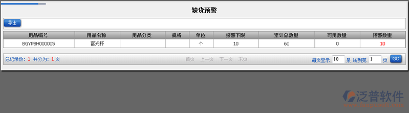 缺貨預(yù)警為我們及時(shí)購(gòu)買辦公用品提供幫助,當(dāng)某一個(gè)辦公用品低于我們的報(bào)警下限,系統(tǒng)將會(huì)把該辦公用品信息自動(dòng)進(jìn)行缺貨預(yù)警提醒,用戶在缺貨預(yù)警功能中即可看到哪些辦公用品需要及時(shí)購(gòu)買。