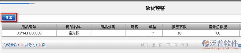 2、點(diǎn)擊【導(dǎo)出】即可將所有的缺貨預(yù)警信息導(dǎo)入出來,方便我們拿去對(duì)照單子進(jìn)行購(gòu)買缺貨的辦公用品