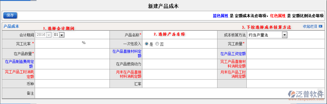 注意:藍(lán)色屬性是定額成本法必填項(xiàng),紅色屬性是定額比例法必填項(xiàng)