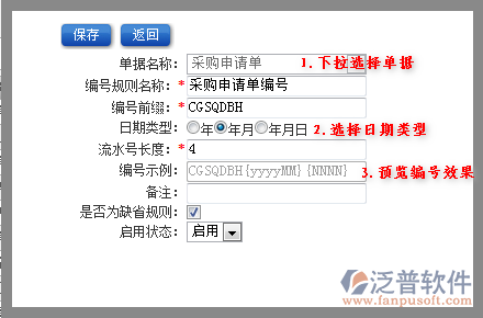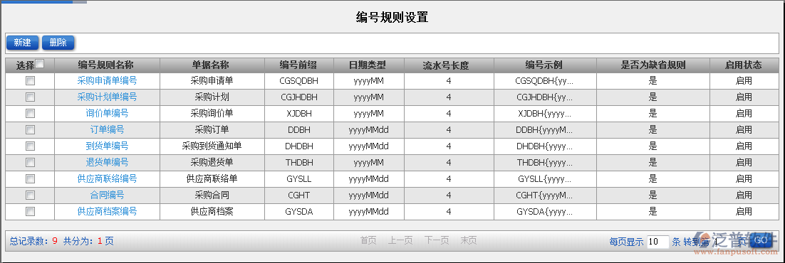 首先泛普軟件ERP軟件采購模塊需要設(shè)置這些編號:采購申請單編號、采購計劃單編號、詢價單編號、訂單編號、到貨單編號、退貨單編號、供應(yīng)商聯(lián)絡(luò)編號、合同編號、供應(yīng)商檔案編號。