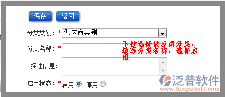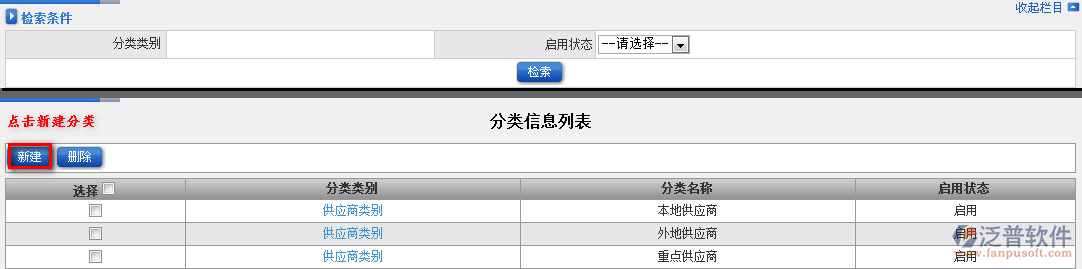 此處的分類設(shè)置主要是設(shè)置泛普軟件ERP系統(tǒng)供應(yīng)商管理的供應(yīng)商分類,系統(tǒng)中有以下分類需要設(shè)置:供應(yīng)商類別、供應(yīng)商優(yōu)質(zhì)級(jí)別、供應(yīng)商聯(lián)絡(luò)期限、供應(yīng)商聯(lián)絡(luò)事由、采購類別、供應(yīng)商聯(lián)系人類型。