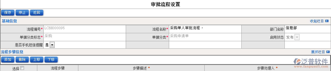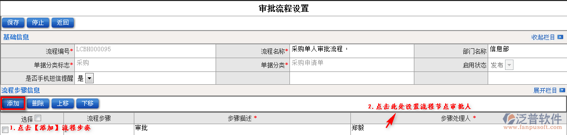 3.填寫流程名稱,使用部門范圍,是否短信提醒等,最后進(jìn)入流程步驟設(shè)置。點(diǎn)擊【添加】