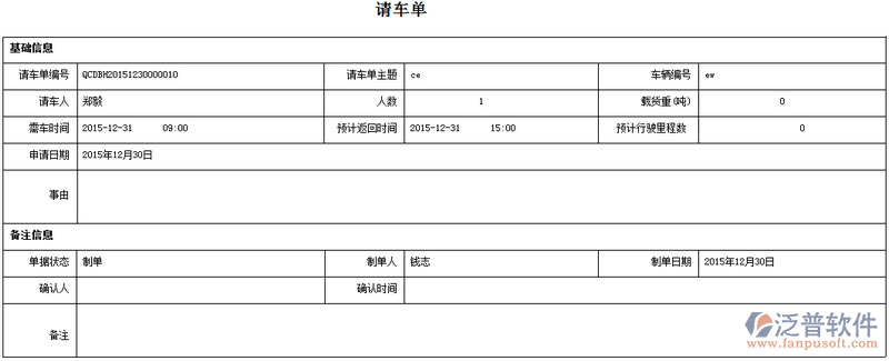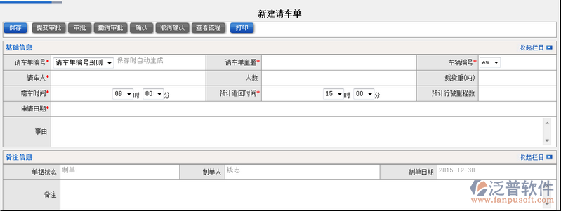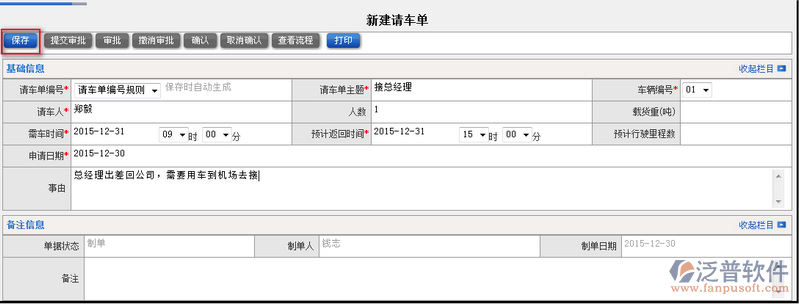 2、填寫完請(qǐng)車單的所有信息后,點(diǎn)擊【保存】即可完成基本信息操作。如圖: