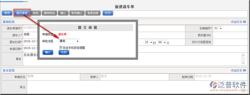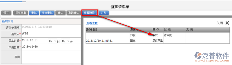 3、保存好的請(qǐng)車信息,點(diǎn)擊【提交審批】流程即可進(jìn)入審批狀態(tài)。如圖: