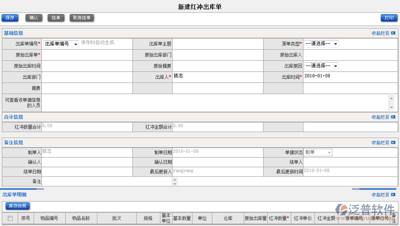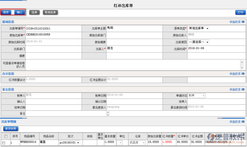 2、填寫完沖紅出庫單中的詳細(xì)信息,點(diǎn)擊【保存】后便可進(jìn)入【確認(rèn)】操作。如圖:
