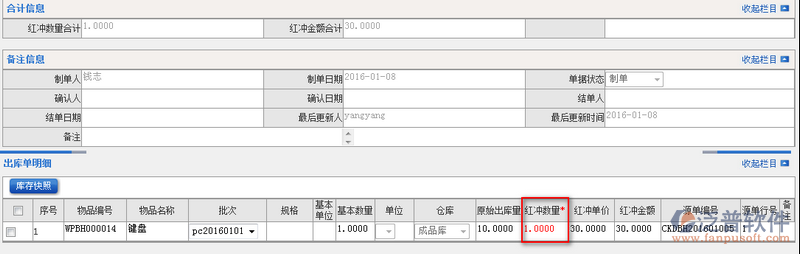 出庫以后東西要退庫,則退庫產(chǎn)品要做紅沖單,作為抵消,相反,倉庫如果購貨入庫,如入庫產(chǎn)品不合格要退貨,也要做紅沖單作為抵消。新建沖紅出庫單主要包含的屬性有:出庫單編號、原始出庫單、源單類型、出庫時間、出庫人、出庫明細(xì)等