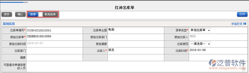 4、確認(rèn)后的沖紅出庫單,便可進(jìn)行【結(jié)單】操作。如圖: