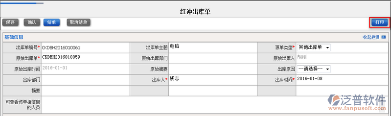 5、在新建沖紅出庫單中,ERP系統(tǒng)為用戶提供打印功能,點(diǎn)擊【打印】即可。如圖: