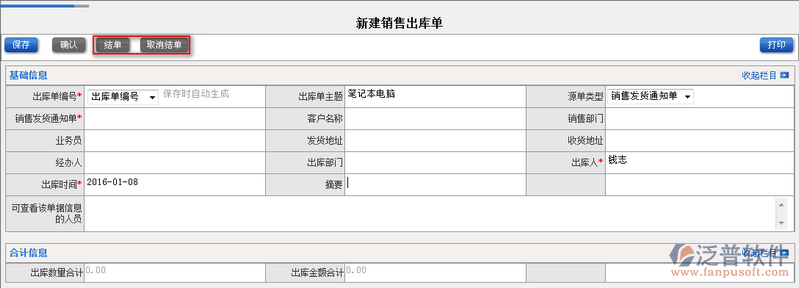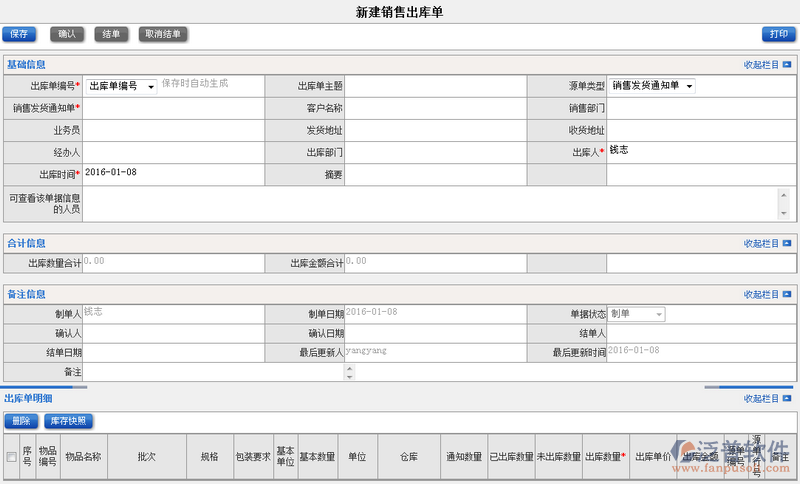 銷售出庫(kù)單在產(chǎn)品已經(jīng)賣出的情況下使用,【新建銷售出庫(kù)單】主要針對(duì)銷售出的產(chǎn)品進(jìn)行管理。新建銷售出庫(kù)單中主要包含的屬性有:出庫(kù)單編號(hào)、銷售發(fā)貨通知單、出庫(kù)時(shí)間、出庫(kù)人、出庫(kù)明細(xì)等