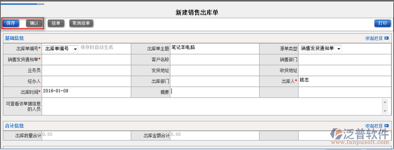 2、填寫完銷售出庫(kù)單中的相關(guān)信息,點(diǎn)擊【保存】便可對(duì)相應(yīng)的銷售出庫(kù)單進(jìn)行【確認(rèn)】操作。如圖: