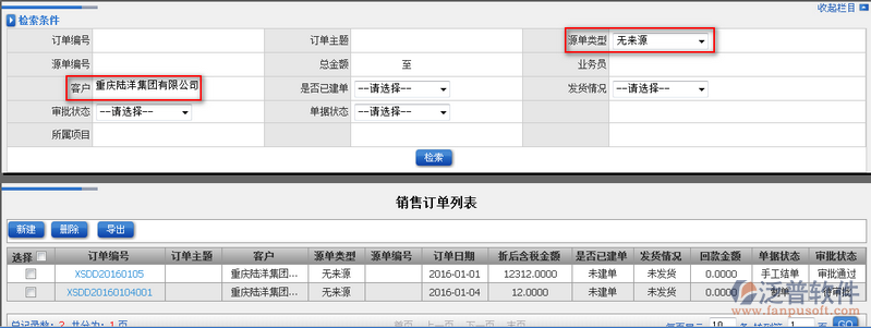 2、通過上圖中的檢索條件便可對(duì)所有的銷售訂單進(jìn)行模糊查詢。查詢條件可以為多條件或單個(gè)條件進(jìn)行查詢。如圖:
