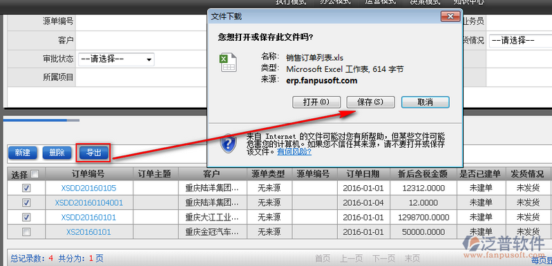 4、選中需要導(dǎo)出的銷售訂單信息,點(diǎn)擊【導(dǎo)出】即可實(shí)現(xiàn)銷售訂單信息的導(dǎo)出功能。如圖: