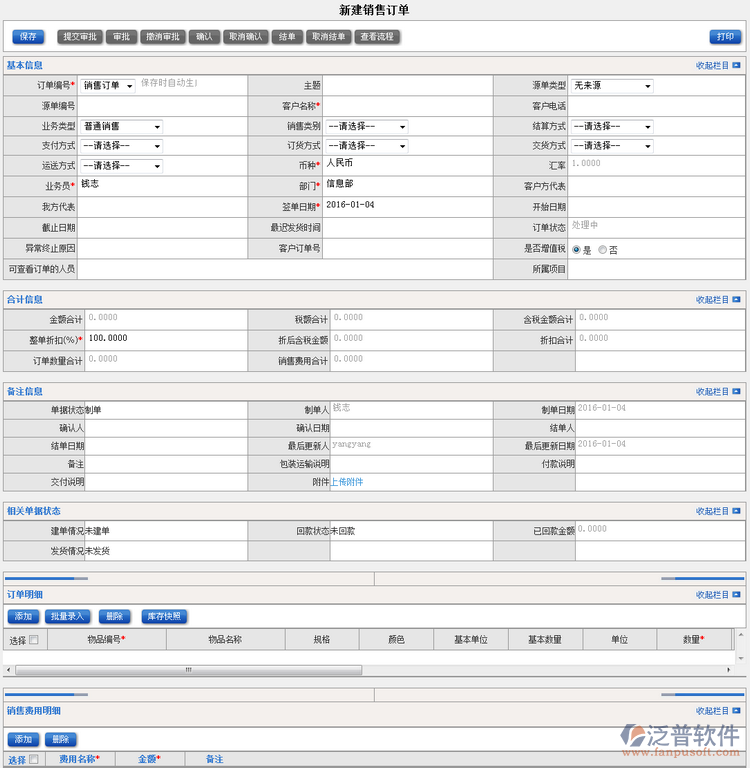 2、填寫完銷售訂單中的基本信息、合計(jì)信息、備注信息以及訂單、銷售相關(guān)費(fèi)用后,便可點(diǎn)擊【保存】進(jìn)入【提交審批】狀態(tài)。如圖:
