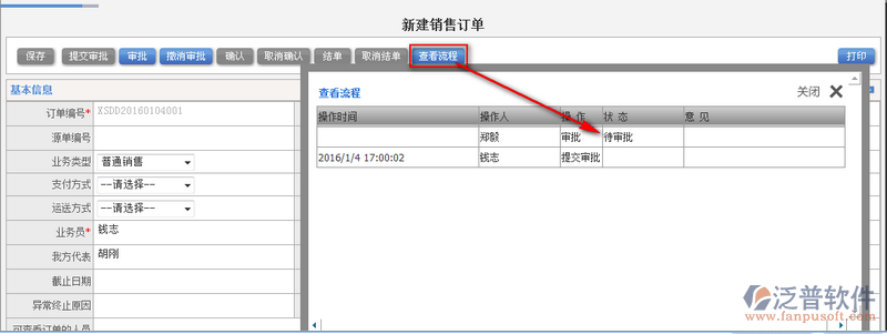3、提交審批后的流程,可以通過【查看流程】對其提交審批的流程進(jìn)行查看審批狀態(tài)。如圖: