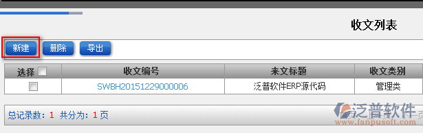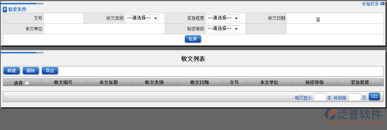 4、在【收文列表】頁面中系統(tǒng)關(guān)聯(lián)【新建收文】模塊,點(diǎn)擊【新增】即可進(jìn)入收文新增頁面。如圖: