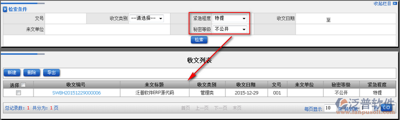 2、通過上圖中的上半部分檢索條件,用戶可以按照自己的操作習(xí)慣進(jìn)行模糊查詢,方便快速找到自己想要的收文(檢索條件支持單個(gè)條件或者多個(gè)條件一起查詢)。如圖: