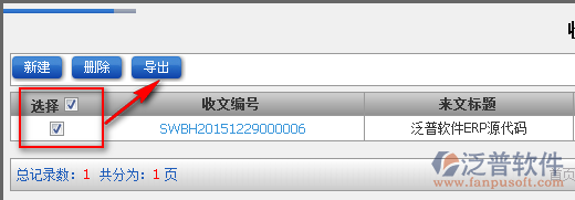 5、查詢到的收文,可以按照用戶的需要進(jìn)行導(dǎo)出處理。選中需要導(dǎo)出的收文,點(diǎn)擊【導(dǎo)出】即可完成此收文的導(dǎo)出。如圖: