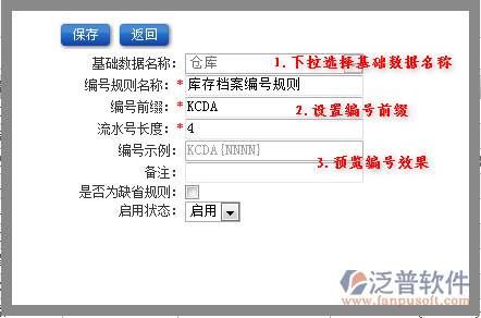 2.泛普軟件系統(tǒng)設(shè)置需要設(shè)置:庫存檔案編號規(guī)則、流程編號規(guī)則、物品編號、人才儲備編號規(guī)則、在職人員編號規(guī)則、倉庫編號規(guī)則 、設(shè)備編號規(guī)則、辦公用品編號規(guī)則、客戶編號規(guī)則、供應(yīng)商編號規(guī)則、競爭對手編號規(guī)則、部門編號規(guī)則、往來單位編號規(guī)則、崗位編號。