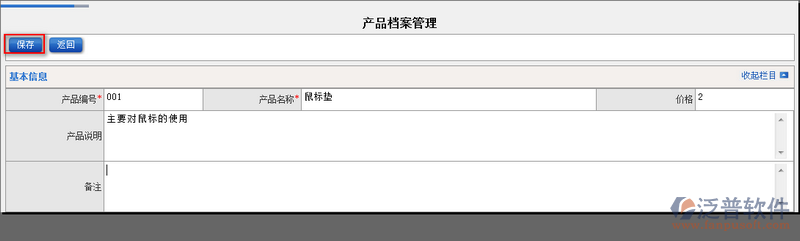 2、點(diǎn)擊【新建】便可進(jìn)入產(chǎn)品信息的新增頁(yè)面中。填寫(xiě)完相關(guān)信息,點(diǎn)擊【保存】即可。如圖: