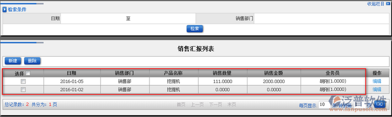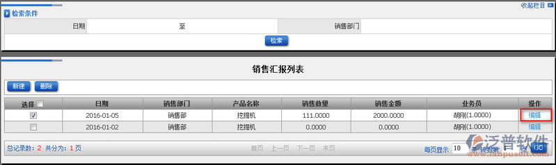 2、通過上圖中的檢索條件,用戶可以快速查詢到對應的銷售匯報信息。如圖: