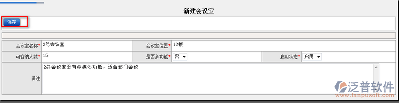 2、填寫(xiě)完相應(yīng)的信息,點(diǎn)擊【保存】即可完成新會(huì)議室的創(chuàng)建。如圖: