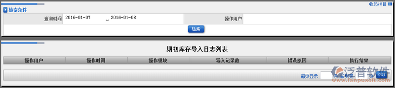 2、通過上圖中提供的檢索條件,用戶可根據(jù)實際情況對所有的期初庫存導入進行查詢。如圖: