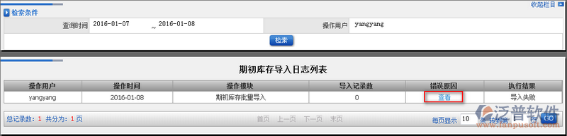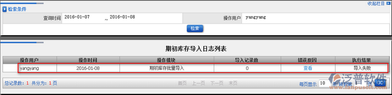 3、查詢到的期初庫存導入日志中,可以詳細查看到導入記錄數(shù)、發(fā)生錯誤的原因以及執(zhí)行結(jié)果。如圖:
