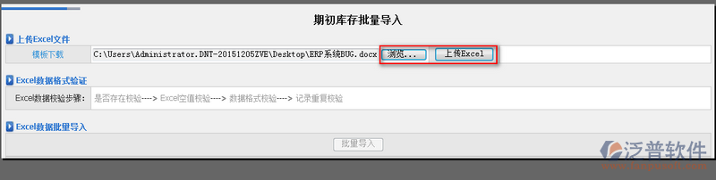 4、填寫完的期初信息,通過系統(tǒng)中的【瀏覽】便可【上傳Excel】。如圖: