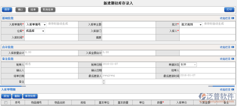1、點(diǎn)擊【新建期初庫存錄入】進(jìn)入主界面。在此頁面可以創(chuàng)建新的期初庫存信息。如圖: