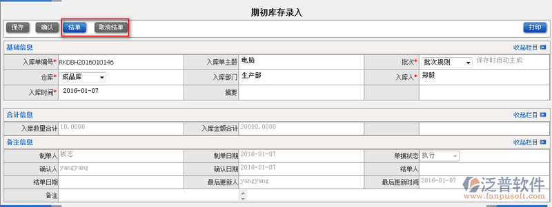 3、確認(rèn)后的期初庫存便可進(jìn)行【結(jié)單】處理。如圖: