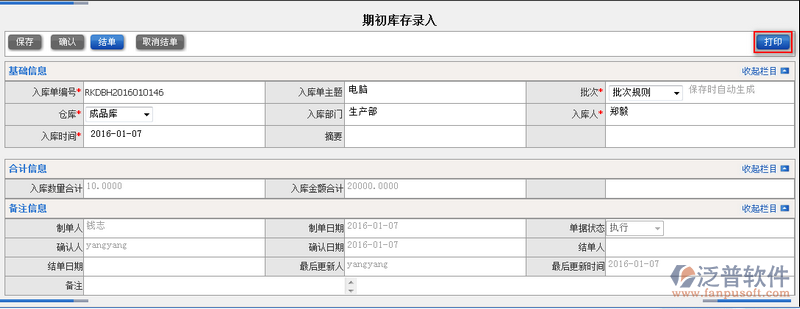 4、在新建期初庫存新增頁面,系統(tǒng)提供直接打印功能,點(diǎn)擊【打印】即可。如圖: