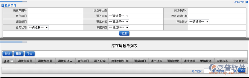 在上一個模塊中新建的庫存調(diào)撥單,都會顯示在【庫存調(diào)撥單列表】中。所有的庫存調(diào)撥單可以通過:調(diào)撥單編號、調(diào)撥單主題、調(diào)撥申請人、要貨部門等相關(guān)條件進(jìn)行模糊查詢