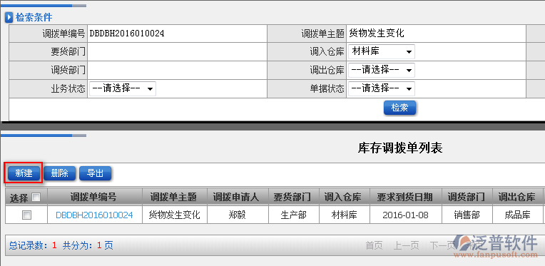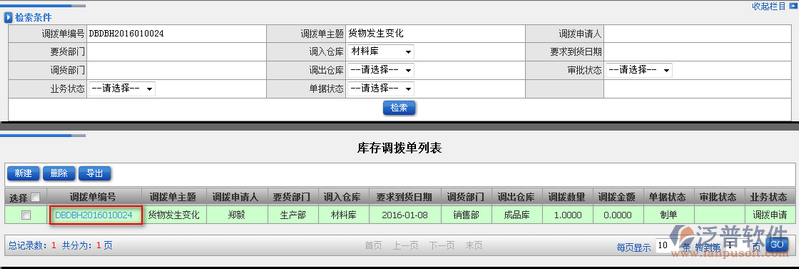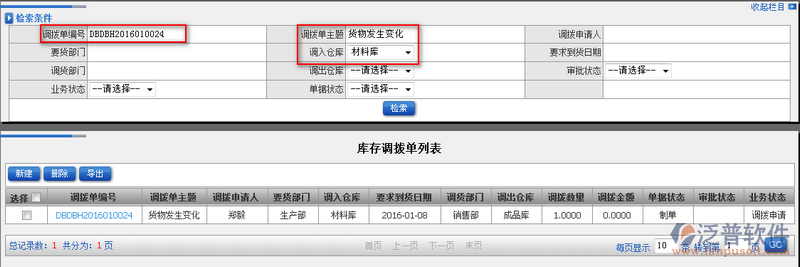 2、通過上圖中的檢索條件,用戶可快速查詢到自己想要的庫存調(diào)撥單。查詢條件可以為多個條件同時查詢。如圖: