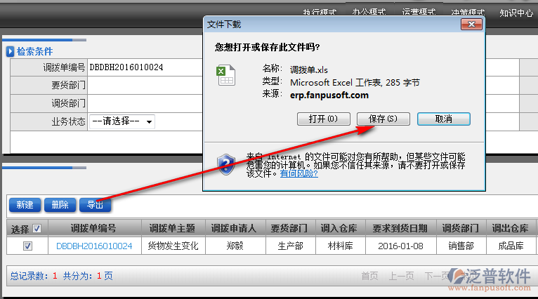 4、庫存調(diào)撥單頁面系統(tǒng)還為用戶提供導(dǎo)出功能,選中需要導(dǎo)出的數(shù)據(jù),點(diǎn)擊【導(dǎo)出】即可。如圖: