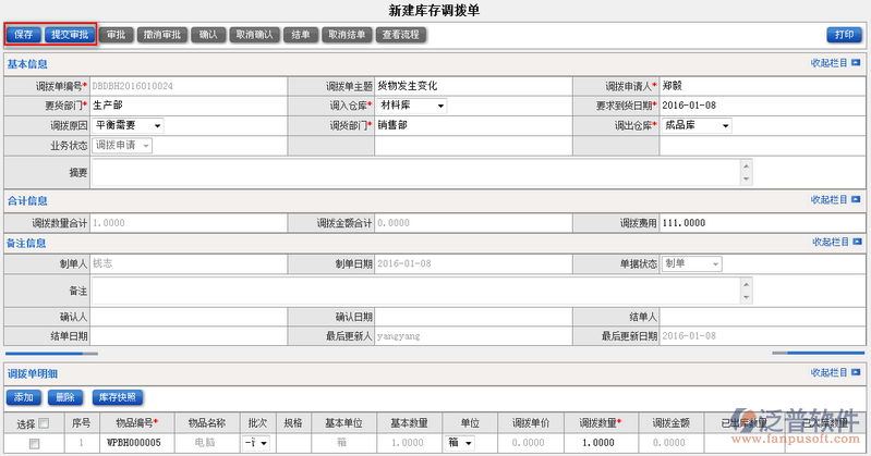 2、填寫完庫(kù)存調(diào)撥單的相關(guān)點(diǎn)擊,點(diǎn)擊【保存】后便可進(jìn)行【提交審批】操作。如圖: