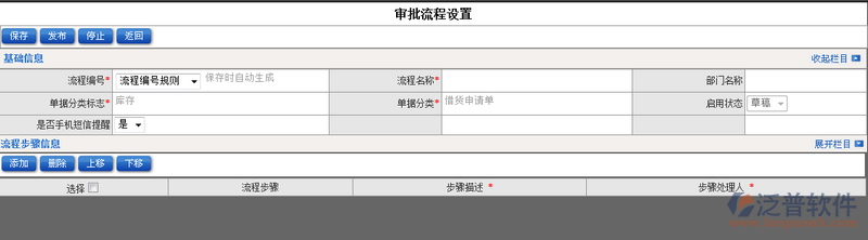 審批流程主要對(duì)庫(kù)存管理中的相關(guān)單據(jù)進(jìn)行流程配置。審批流程配置過(guò)程中需要填寫(xiě)的屬性有:流程編號(hào)、流程名稱、單據(jù)分類標(biāo)志等相關(guān)信息