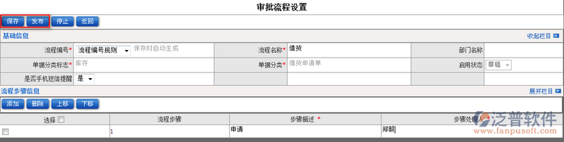 4、填寫(xiě)完審批流程中的相關(guān)信息,點(diǎn)擊【保存】即可【發(fā)布】新的審批流程。如圖:
