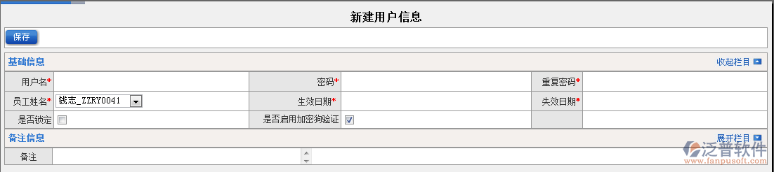 2.設(shè)置用戶名、密碼、重復(fù)密碼、綁定員工、生效日期、失效日期、是否鎖定、是否啟用加密狗驗(yàn)證。