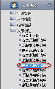 1.點擊辦公模式→行政管理→人事調(diào)動→快速離職通道,進入“快速離職通道”窗口: