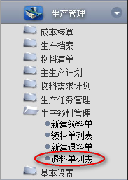 1.點擊辦公模式→生產(chǎn)管理→生產(chǎn)領料管理→退料單列表,進入“退料單列表”窗口: